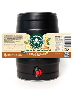 Pakuotėje yra 1 vnt. 5 litrų statinė kombuchos IMBIERAS • SVARAINIS • PIPIRAS
