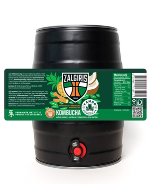 Pakuotėje yra 1 vnt. 5 litrų statinė kombuchos KOKOSAS • IMBIERAS • ANANASAS